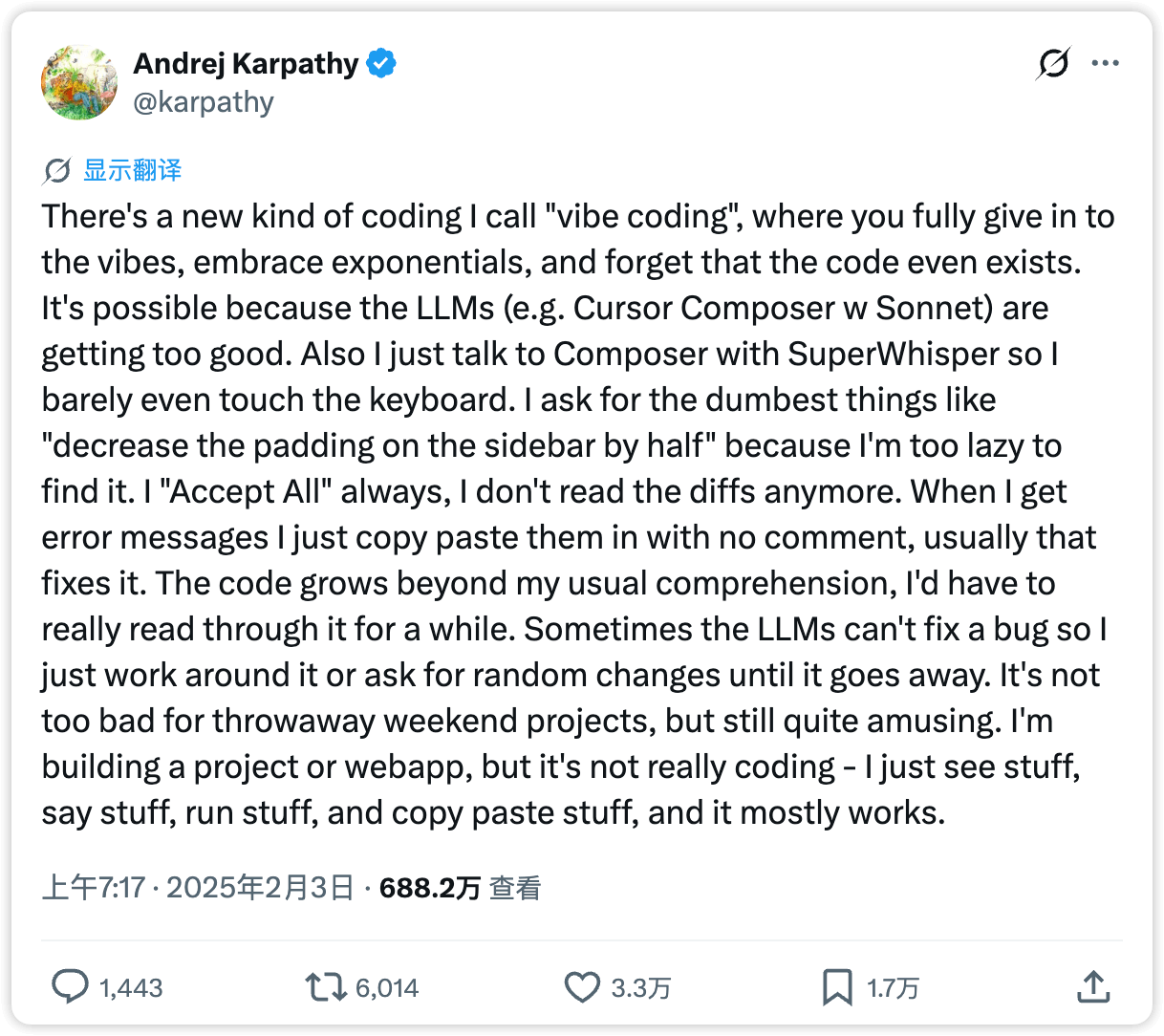 「Vibe Coding」という言葉は、Andrej Karpathy が X に投稿したツイート に由来する。その言葉は当時、多くの人が AI コーディングツールを使う中で薄々感じていながら、まだうまく言語化できていなかった体験の変化を、かなり正確に捉えていた。