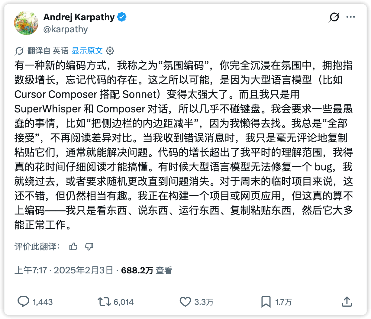 “Vibe Coding” 这个词来源于 Andrej Karpathy 在 X 上的一条推文。当时它准确描述了很多人在使用 AI Coding 工具时,已经隐约感受到、但还没说清楚的体验变化。